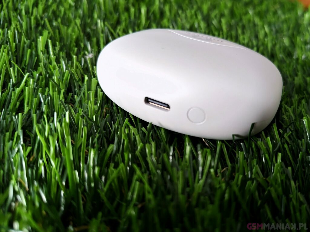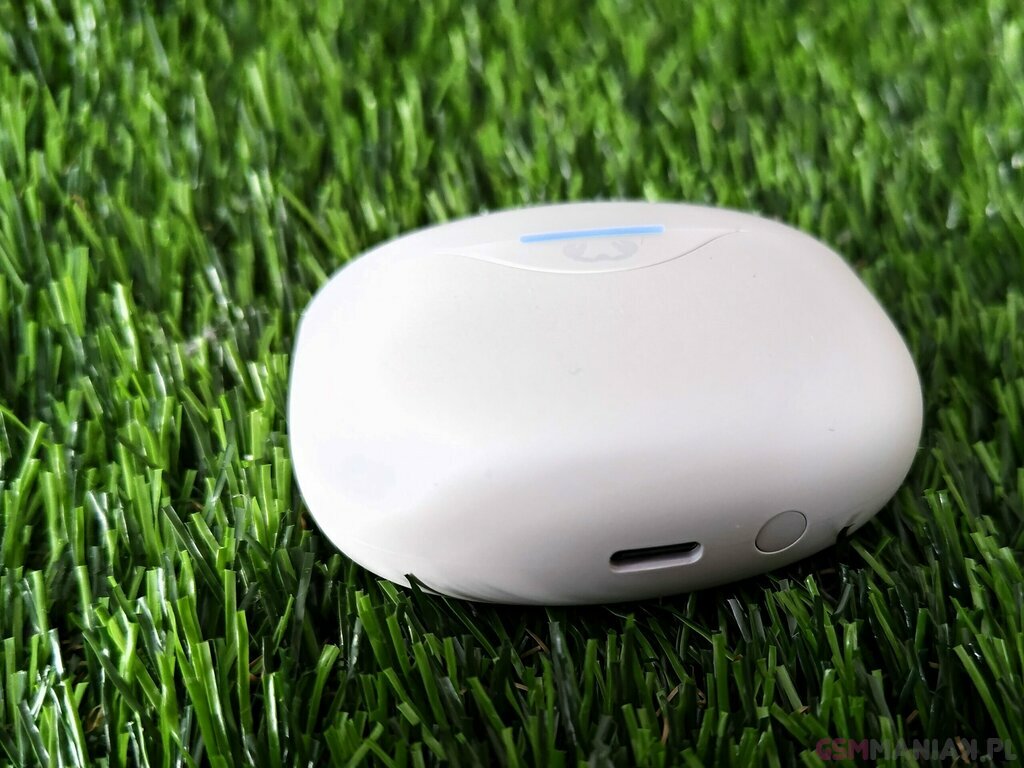 Etui dla słuchawek wykonano z tego samego materiału, co same słuchawki. Jest zatem dobrze, a matowe wykończenie to coś, co akurat bardzo lubię, gdyż jest mniej podatne na zarysowania i pozwala utrzymać urządzenie w czystości przez dłuższy czas. Na froncie mamy pasek LED sygnalizujący stan naładowania, a na dolnej części port USB typu C do ładowania.