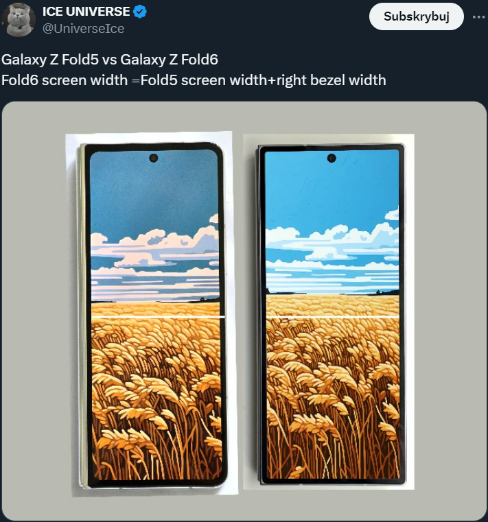Ostatnią rzeczą płynącą z dzisiejszego przecieku jest na pewno szerokość przedniego ekranu. To również coś, za co Samsung był najczęściej ganiony. Nie mogę powiedzieć, by w Galaxy Z Fold6 było tak dobrze, jak w OnePlusie Open. Jest to jednak krok w dobrą stronę. Według IceUniverse zewnętrzny wyświetlacz zostanie poszerzony o grubość ramki. To oznacza jakieś 2-3 mm.