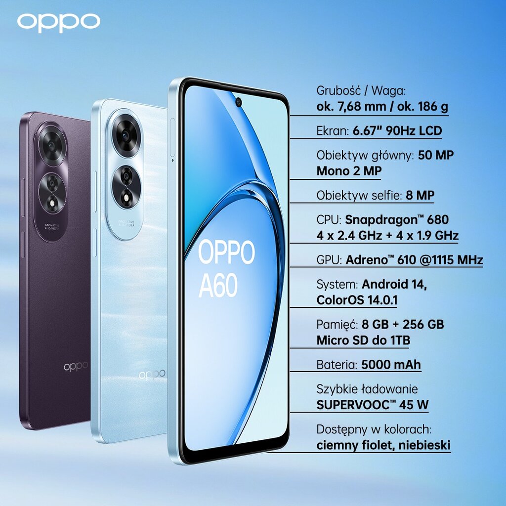 OPPO A60 trafił do Polski w dwóch wersjach kolorystycznych: fioletowej i niebieskiej. Wariant pamięci jest tylko jeden, 8/256 GB. Cena OPPO A60 w Polsce została ustalona na niewygórowane 799 złotych. Co dostajemy za te pieniądze?