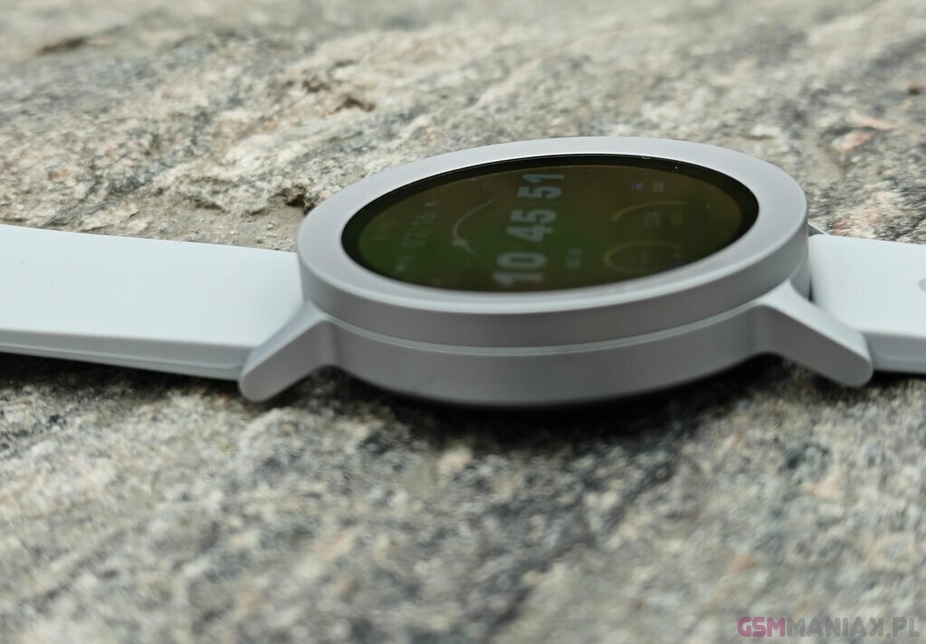 Koperta spełnia normę IP68, ale wśród trybów sportowych nie znajdziesz pływania. To raczej dość standardowa przywara tanich smartwatchy. Zabrałem go za to na rower, bieganie i drążki. Obudowa wygląda dokładnie tak, jak po wyjęciu z pudełka. Jedynym plastikowym elementem jest tutaj dekiel z sensorami. Tutaj rys również nie stwierdzono.
