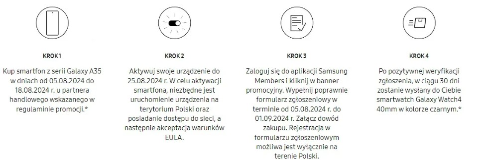 Kolejny nasz krok konieczny do odebrania zegarka to aktywacja smartfona do niedzieli, 25 sierpnia 2024 roku. Model Galaxy A35 należy uruchomić na terenie naszego kraju z włożoną do urządzenia kartą SIM i zaakceptować postanowienia umowy licencyjnej użytkownika końcowego (EULA). Następny krok to zalogowanie się do aplikacji Samsung Members, kliknięcie banner promocyjny i wypełnienie formularza zgłoszeniowego do 1 września 2024.