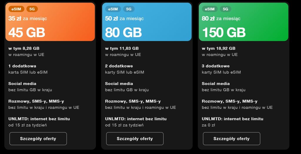 Do tego dostajemy oczywiście nielimitowane rozmowy i SMS-y/MMS-y do wszystkich sieci komórkowych i stacjonarnych w Polsce, obsługę eSIM czy roaming w Unii Europejskiej. Plany startują od 35 złotych miesięcznie.