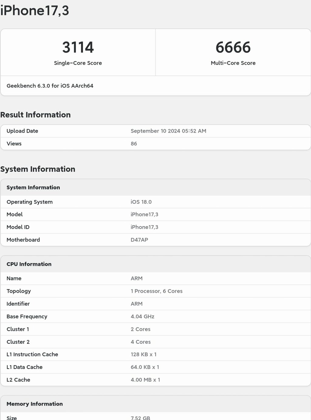 - Apple iPhone 16 w Geekbench / fot. Kartikey Singh
