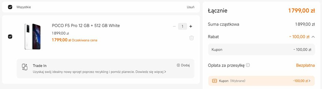 Sklep producenta mi.com przygotował ciekawą ofertę dla nowych użytkowników. Nie obawiaj się, jeżeli Twoje konto nie należy do najświeższych. Wystarczy zalogować się z innego maila Google, by móc skorzystać z kuponu powitalnego. Rabat obniża cenę o 100 złotych, dzięki czemu POCO F5 Pro w konfiguracji 12/512 GB kosztuje tylko 1799 złotych.