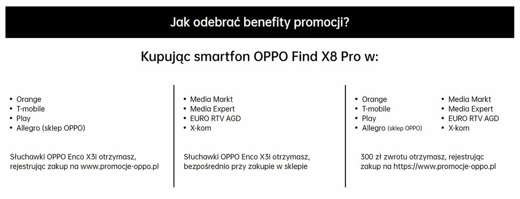Jeśli zdecydujesz się na jego nabycie od 5 do 24 grudnia, to możesz liczyć na 300 złotych zwrotu, dodatkowy pakiet gwarancyjny i słuchawki OPPO Enco X3i w prezencie. Jak odebrać te benefity u poszczególnych sprzedawców? To powie Ci strona producenta oraz poniższa grafika: