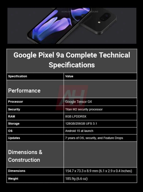 Google Pixel 9a na renderach/ fot. OnLeaks, Android Headlines