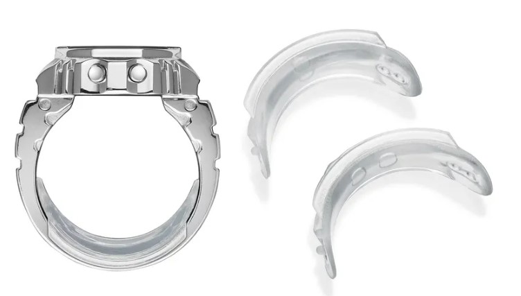 Sprzęt dostępny jest w jednym rozmiarze z 20 mm średnicy, ale istnieje opcja dokupienia specjalnych nakładek zmieniających jego rozmiar. Wygląda to tak jak na zdjęciu poniżej. Dzięki nim zarówno powiększymy, jak i pomniejszymy rozmiar zegarka.