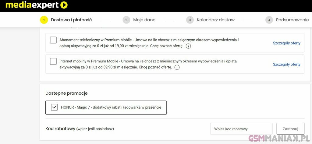 Media Expert przygotował specjalną promocję na smartfon Honor Magic 7 Pro. Gdy dodasz go do wirtualnego koszyka i zaznaczysz specjalne pole w sekcji dostępne promocje (jak na obrazku poniżej), to dostaniesz rabat w wysokości aż 800 złotych. Do tego otrzymasz ładowarkę przewodową 100W w prezencie. Za ten zestaw zapłacisz 4199 złotych. To aż 1600 zł mniej niż trzeba było zapłacić w ciągu ostatnich 30 dni przed obniżką.