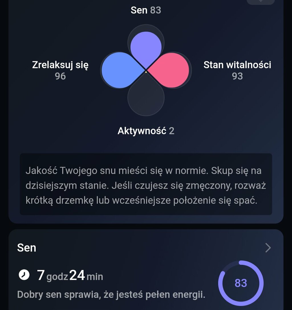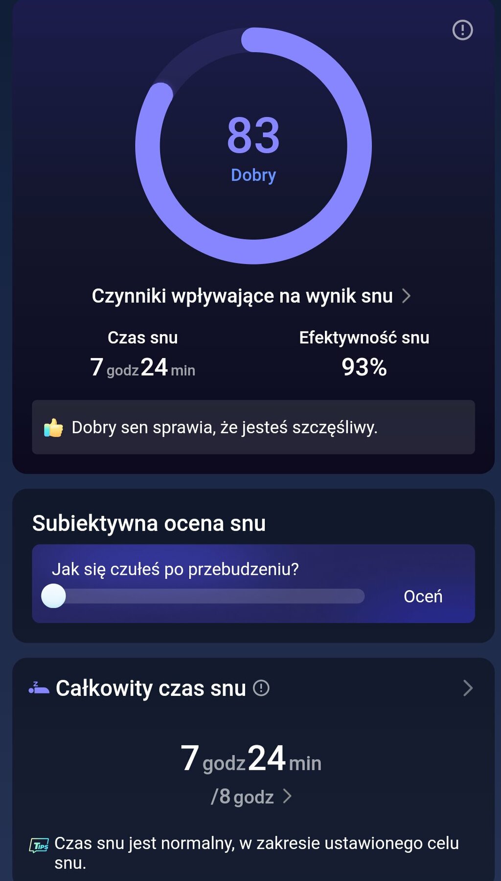 Najprostsza odpowiedź brzmi – to zależy. Jeżeli chodzi o sen, to nie mam żadnych zastrzeżeń. Być może przebudzenia wydają mi się nieco wyższą wartością niż te mierzone ze smartwatcha, ale może to kwestia tego, że to smartring jest dokładniejszy.