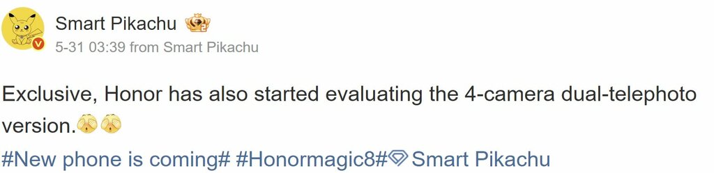 Według Smart Pikachu, jednego z najpopularniejszych chińskich leaksterów, Honor Magic8 Pro otrzyma poczwórny zestaw aparatów. Jednym z nich ma być podwójny teleobiektyw o zmiennej ogniskowej, czyli ta sama technologia, która zadebiutuje wraz z Huawei Pura 80 Ultra. To już za tydzień, więc wtedy poznamy szczegóły nowej technologii.