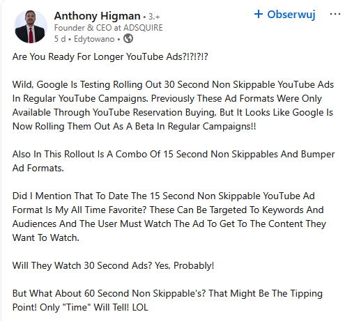 I właśnie dlatego mamy głosy takie, jak ten poniżej. Anthony Higman jest właścicielem agencji reklamowej ADSQUIRE i postanowił skomentować informację o dłuższych, niepomijalnych reklamach na platformie YouTube. W skrócie, patrząc na to okiem właśnie reklamodawcy, czy twórcy reklam, raczej cieszy się z takiego podejścia Google do sprawy. No i oczywiście jest teza, iż użytkownicy „dadzą radę” z oglądaniem tych 30-sekundowych spotów.