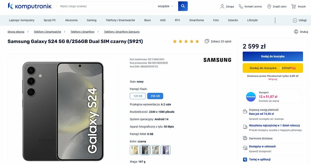 Samsung wraz ze swoimi partnerami handlowymi w Polsce obniżył cenę Galaxy S24. U większości sprzedawców wynosi ona 2649 złotych za wersję 8/128 GB. Znalazłem jednak w Komputronik wariant 8/256 GB za 2599 złotych, co jest jeszcze ciekawszą opcją. Wiele wskazuje na to, że niższa cena ex-flagowca Samsung obowiązuje jeszcze tylko dziś, 16 czerwca.