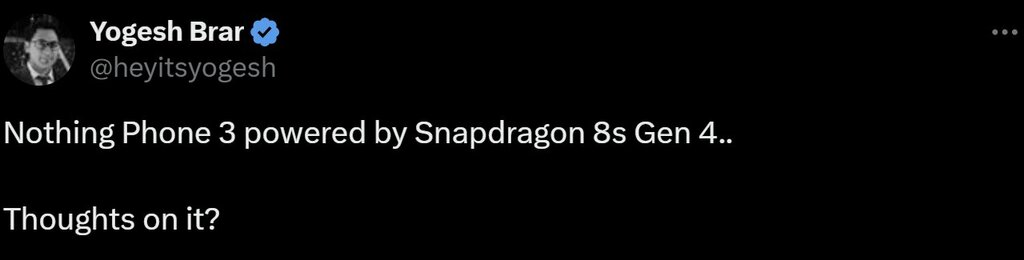 Yogesh Brar udostępnił informacje o procesorze dla Nothing Phone 3. Akurat to źródło rzadko strzela kulą w płot, więc możemy już założyć, że smartfona napędzi Snapdragon 8s Gen 4. Nie wątpię, że wielu będzie narzekać na brak Snapdragona 8 Elite za 800 euro, ale w przypadku poprzednika było dokładnie tak samo. Ponadto jestem przekonany, że dzięki temu Nothing będzie szybciej tanieć.