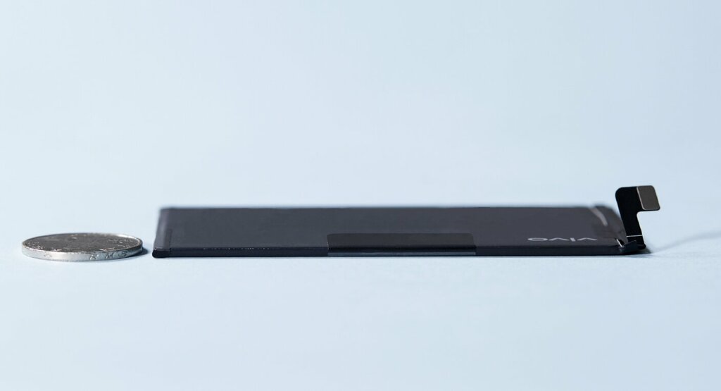 Na zdjęciu widzimy faktyczną grubość baterii, którą położona obok monety jest od niej cieńsza. Jeżeli do tej pory twierdziłeś, że przejście na nową technologię ogniw jest niepotrzebne, to najwyższy czas przemyśleć to jeszcze raz.