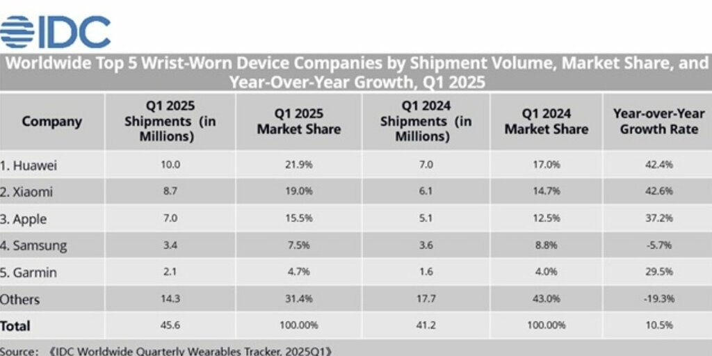 Drugie miejsce zajęło Xiaomi, które przy 42% wzroście ma dla siebie 19% sprzedaży na świecie. To jednak nic przy Huawei, które w pierwszym kwartale sprzedało 10 milionów zegarków (tyle, co Apple i Samsung razem). 22% udziałów w rynku i 42% wzrost mówią same za siebie.