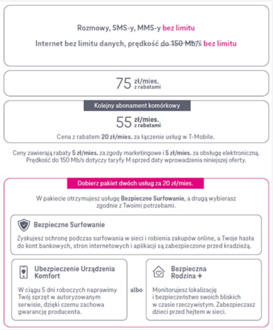 Nowa taryfa T-Mobile kosztuje 75 złotych miesięcznie (i to już z rabatami). To niemało – co dostajemy więc w tej cenie? Możemy liczyć na nielimitowane rozmowy, SMS-y, MMS-y i przede wszystkim internet bez limitu danych i prędkości.