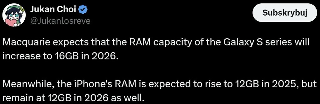 Jeden z Twitterowych leaksterów podzielił się informacją o pamięci w serii Samsung Galaxy S26. Szczerze mówiąc, to wziął mnie z zaskoczenia. Samsung z 16 GB RAM to dla mnie stworzenie równie fantastyczne, co jednorożec. Być może ma to związek z faktem, że iPhone zwiększy ilość pamięci operacyjnej do 12 GB RAM.