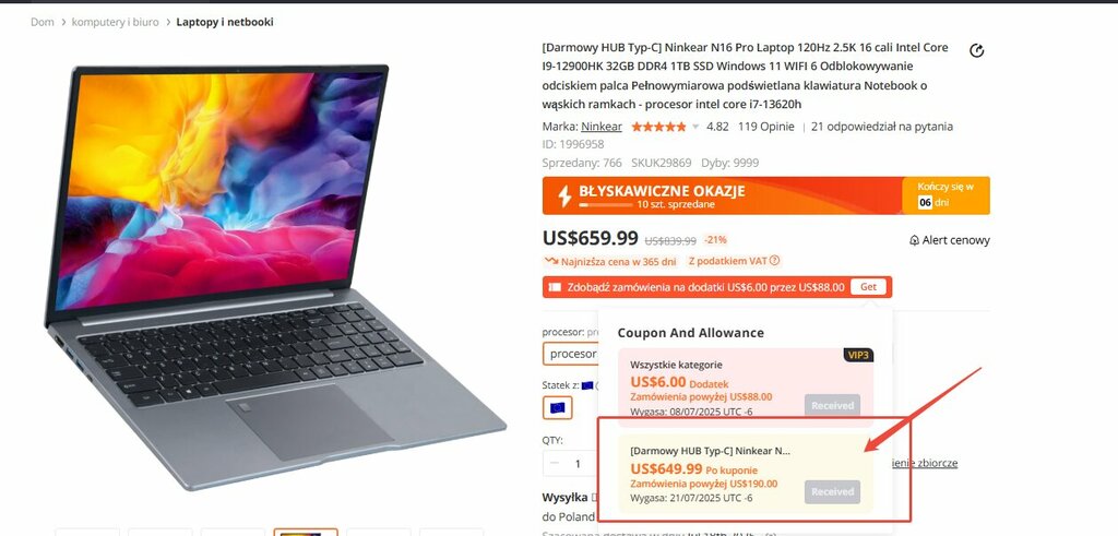 Na początek sama promocja i jej zasady. Jeżeli skorzystasz z kodu rabatowego BGRSPNK16P, to cena spadnie do poziomu 605 dolarów, czyli 2190 złotych. Alternatywnie możesz zapłacić 2300 złotych, korzystając z kuponu na stronie sklepu, ale pierwsza opcja jest oczywiście bardziej opłacalna.