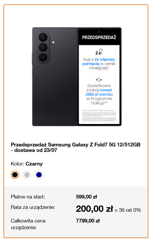 W przypadku modelu Samsung Galaxy Z Fold 7 512 GB, jego dwuletnia eksploatacja wyniesie 9519 złotych, u Galaxy Z Fold 7 5719 złotych, a najtańszego Galaxy Z Flip 7 FE – 5019 zł przez 2 lata. To sporo mniej niż w Play i T-Mobile Polska, a w dodatku – np. w razie kłopotów z zasięgiem – możesz w każdej chwili emigrować do innej sieci. Jedynie Samsung Galaxy Z Fold 7 512 GB wypada nieco taniej w Orange Polska, ale jest to zasługa darmowego abonamentu przez pierwszy kwartał i ceny smartfona wynoszącej nie 8799, a tylko 7799 złotych. Minusem tego rozwiązania jest rozbicie ceny telefonu na aż 36 rat.