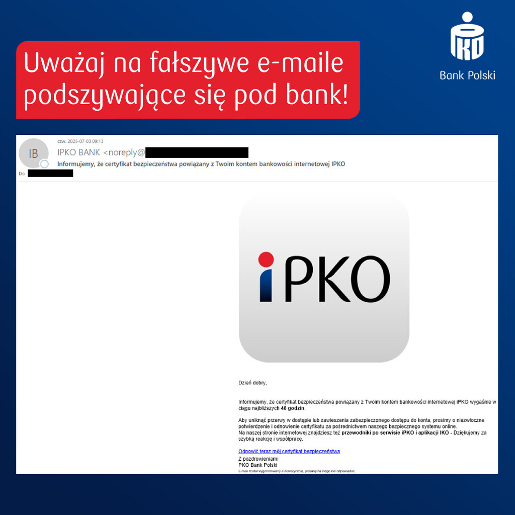 Cyberprzestępcy po prostu próbują wywołać u Was panikę, poczucie pilności. Mają nadzieje, że stosowanie adresu e-mail podobnego do iPKO, wykorzystanie ich grafik i formatu komunikatu wystarczy, żebyście uwierzyli w autentyczność takiej wiadomości. Łatwowierność może w tej sytuacji doprowadzić do tragedii.