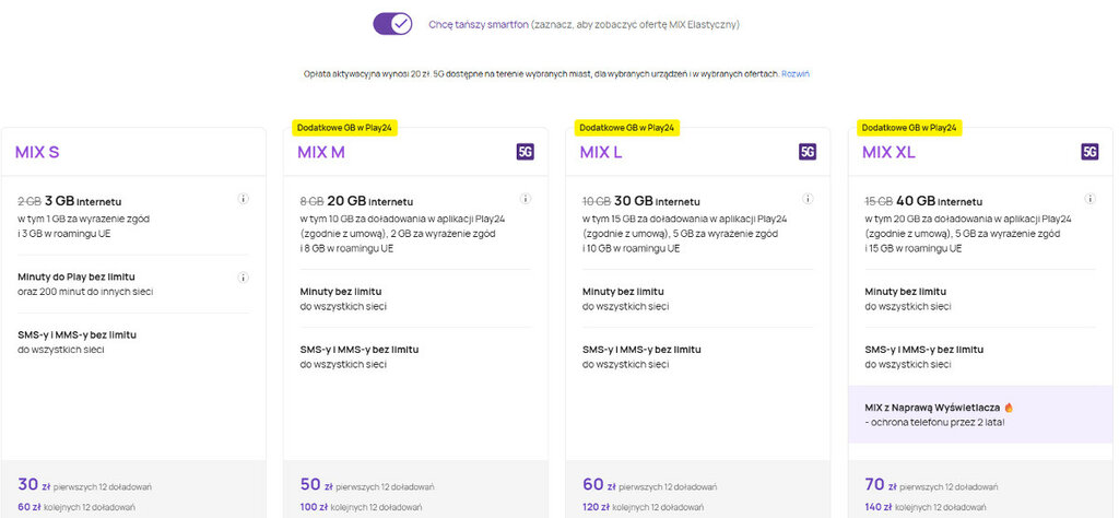 Obecnie fioletowy operator komórkowy oferuje 4 różne pakiety mixa. Są to plany MIX S, MIX M, MIX L oraz MIX XL. Nie licząc tego pierwszego, reszta zapewnia transfer 5G, a także dodatkowe gigabajty w aplikacji mobilnej Play24. Jakie są ich ceny?
