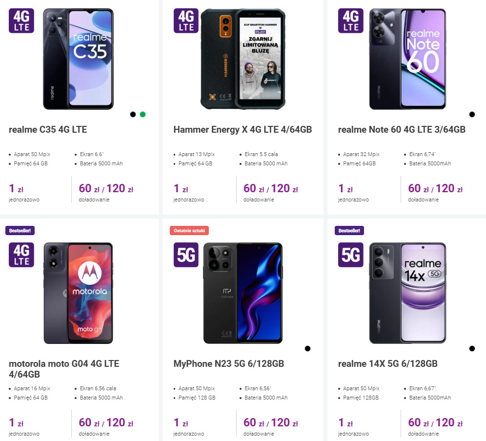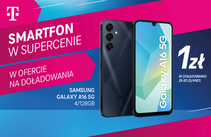 Opłata na start za smartfon może wynosić zaledwie 1 zł, jeżeli klient zdecyduje się na smartfon Samsung Galaxy A16 5G 4/128GB w miesięcznym doładowaniu 80 zł bądź na Xiaomi Redmi 14C 4/128GB w miesięcznym doładowaniu za 70 zł. W ofercie dla przenoszących numer dostępny jest również smartfon T Phone 2 5G (2024) 4/128GB za 1 zł z zestawem akcesoriów (T słuchawki, T Ładowarka) przy miesięcznej kwocie doładowania 80 zł oraz Motorola Moto G04 8/128GB w doładowaniu miesięcznym 60 zł.