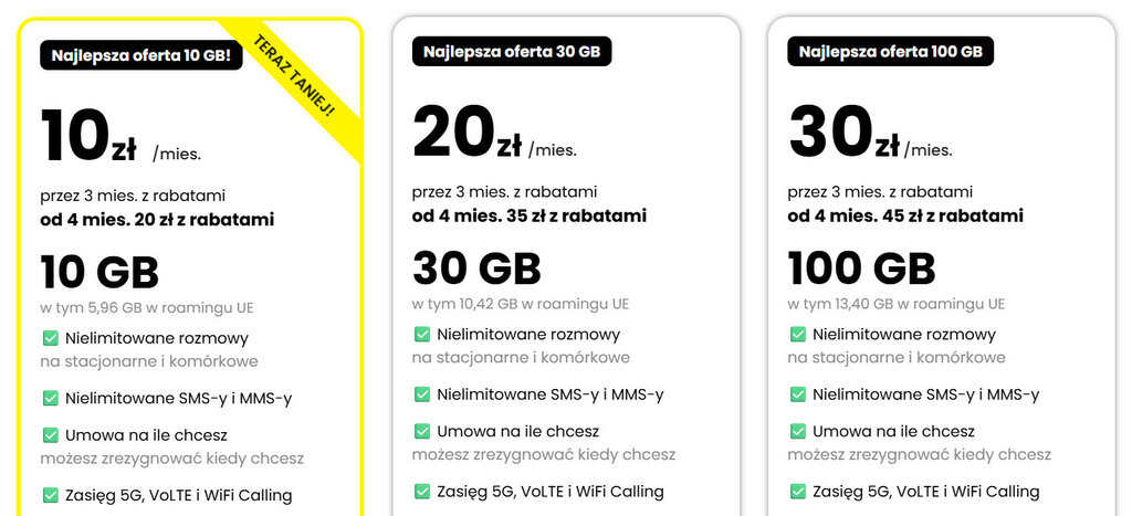 Nie dość, że Twój abonament za 20 złotych miesięcznie (10 zł przez pierwszy kwartał) jest bardzo tani, to jeszcze zapewnia bardzo dobry poziom usług no limit. W dodatku daje zasięg 5G – naturalnie nie w każdej lokalizacji – a także VoLTE i WiFi Calling. Czego chcieć więcej?