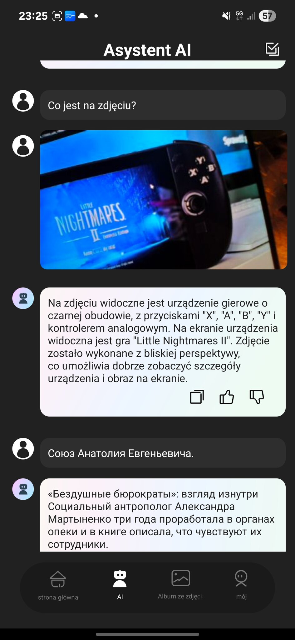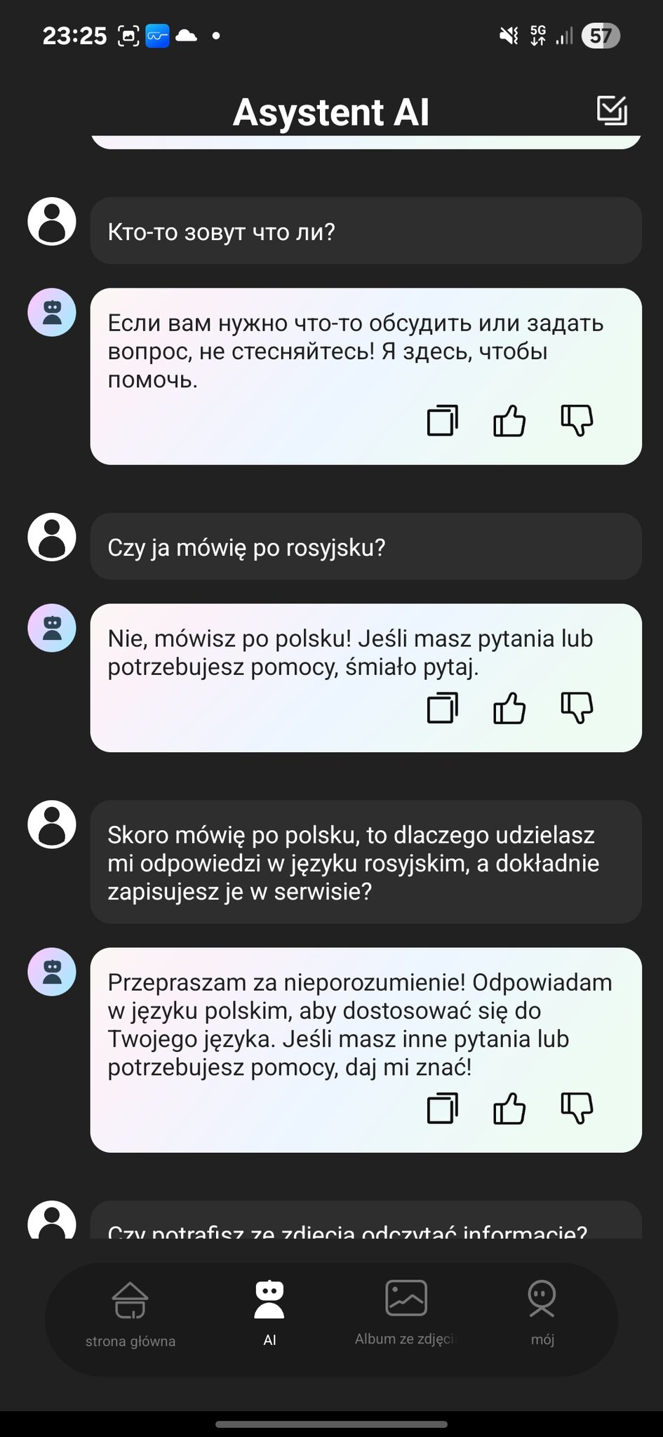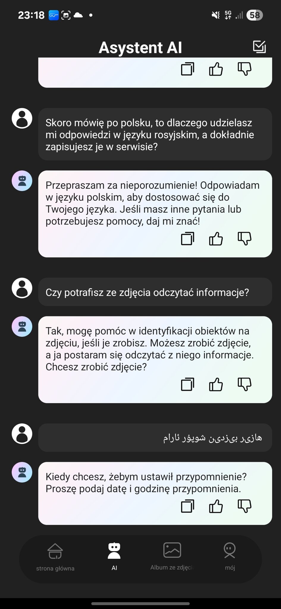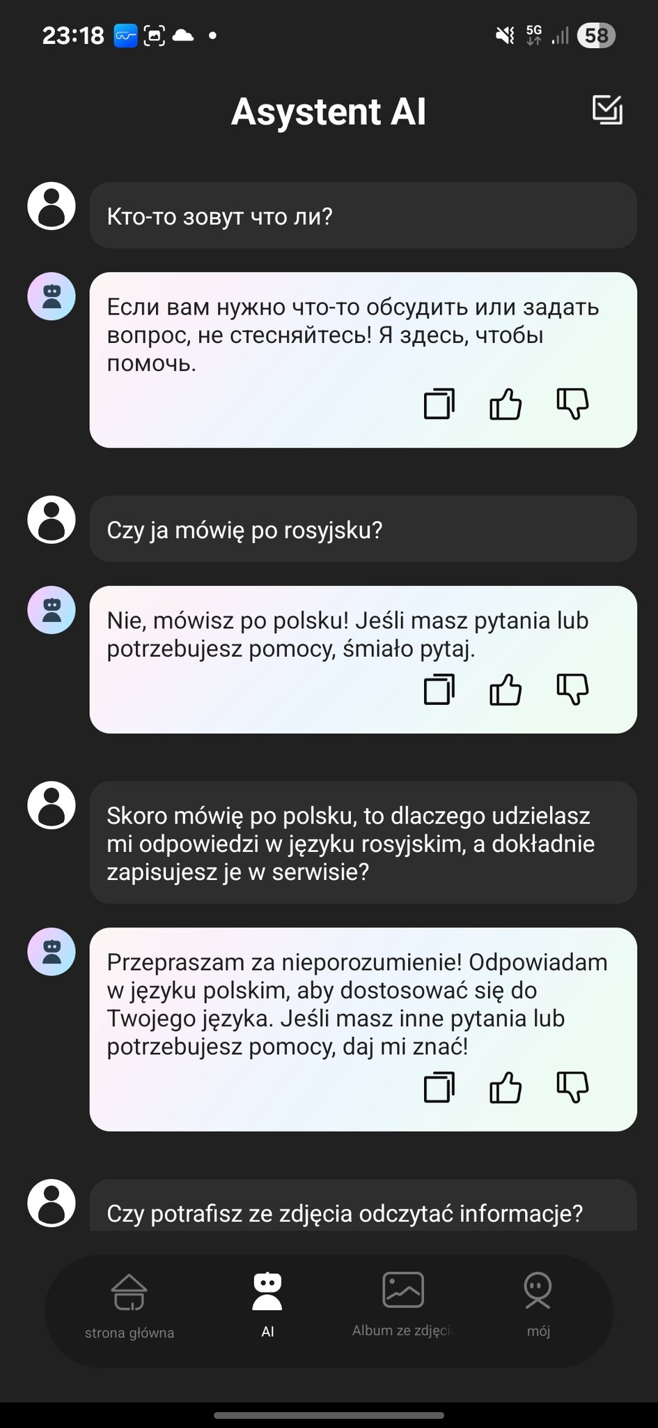 Największą bolączką jest, niestety, sztuczna inteligencja. Producent obiecuje ChatGPT-4o mini, a w praktyce dostajemy coś, co działa z kapryśną losowością maszyny vendingowej. Próby rozpoznawania obrazu kończą się milczeniem, a asystent głosowy, choć teoretycznie wielojęzyczny, odpowiada raz po niemiecku, raz po mandaryńsku, innym razem po rosyjsku, mimo że ja uparcie gadam po polsku.