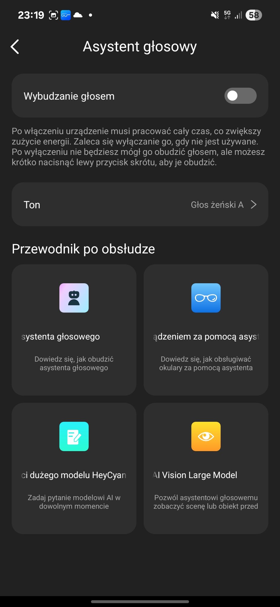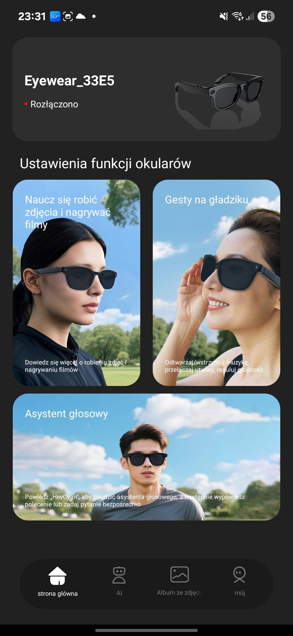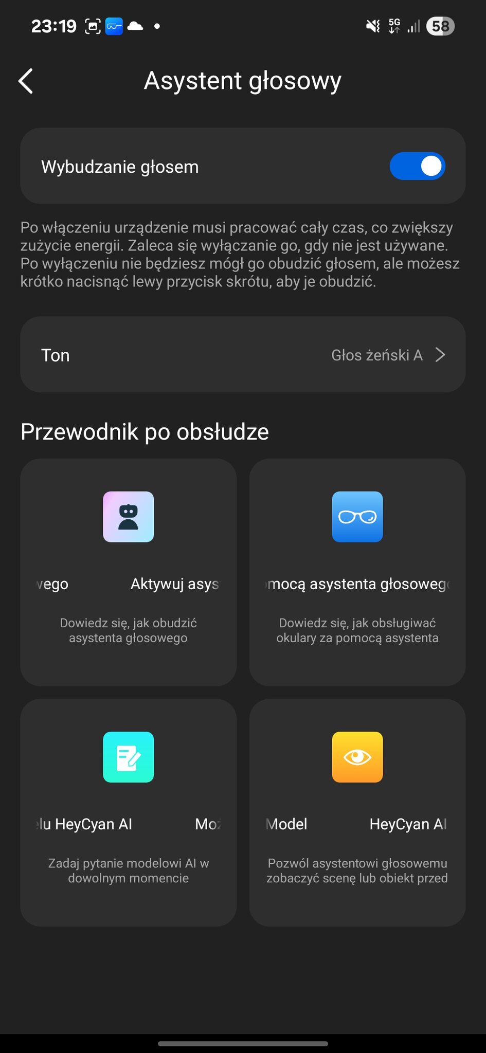 Dedykowana aplikacja Hey Cyan to punkt obowiązkowy dla każdego użytkownika tych okularów. Wizualnie nie mam jej nic do zarzucenia – jest przejrzysta, logicznie podzielona na sekcje i zawiera pomocne wskazówki. Niestety, tłumaczenie na język polski to lekki dramat.