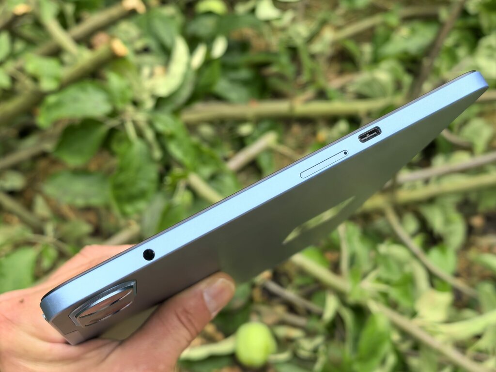 Pod względem rozmieszczenia elementów OSCAL PAD 100 wypada całkiem nieźle. Na górnej ramce, w lewym rogu, znajdziemy przycisk zasilania, a tuż obok przyciski regulacji głośności oraz mikrofon. Na lewym boku umieszczono tackę na kartę SIM, złącze słuchawkowe 3,5 mm i port USB-C.