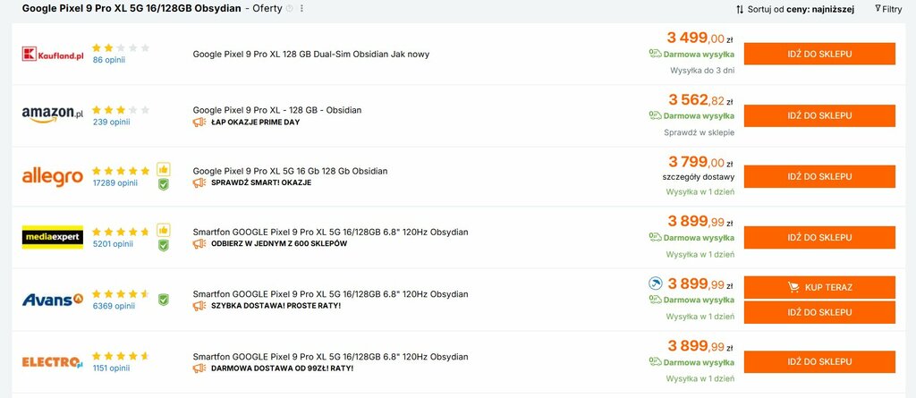 Tym razem polski Amazon zaatakował dobrą propozycją. Za Google Pixel 9 Pro XL w wersji 16/128 GB trzeba aktualnie zapłacić 3415 złotych i uważam tę cenę za bardzo rozsądna. Na tle ostatnich miesięcy kwota wydaje się nad wyraz atrakcyjna, bo ten model jeszcze tańszy w naszym kraju nie był.
