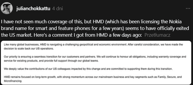 W oświadczeniu HMD stwierdza, że ze względu na skomplikowaną sytuację geopolityczną i ekonomiczną są zmuszeni do zmniejszenia skali swoich operacji w USA. Hej, Konrad AI, co to znaczy? To znaczy, że po wprowadzeniu dodatkowych ceł ich i tak kiepska sprzedaż zmaleje do takiego poziomu, że będą musieli ogłosić upadłość i zająć się połowem krewetek. Co biorąc pod uwagę jakość ich ostatnich premier, nie wydaje się wcale aż tak złym pomysłem.