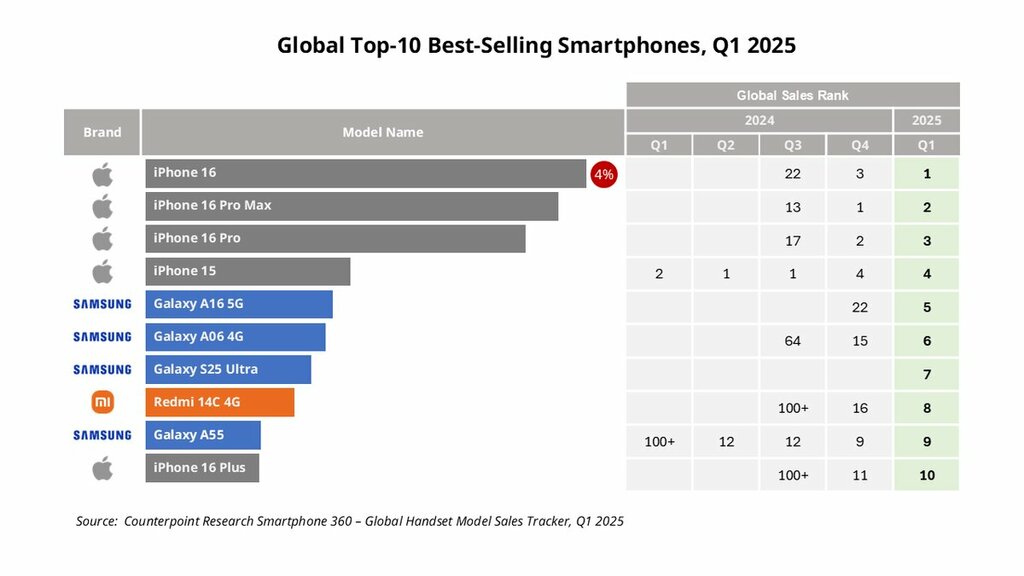 A co z tym najlepiej sprzedającym się smartfonem z Androidem? A no jak widzicie poniżej, poprzednik w postaci Galaxy A16 5G, bardzo często był właśnie tym najpopularniejszym wyborem na półkach sklepowych. W przypadku Q1 2025 niewiele zabrakło mu do iPhone-a 15, chociażby. Można więc niejako założyć z dużym wyprzedzeniem, że i kolejny telefon z tej rodziny będzie radził sobie podobnie.