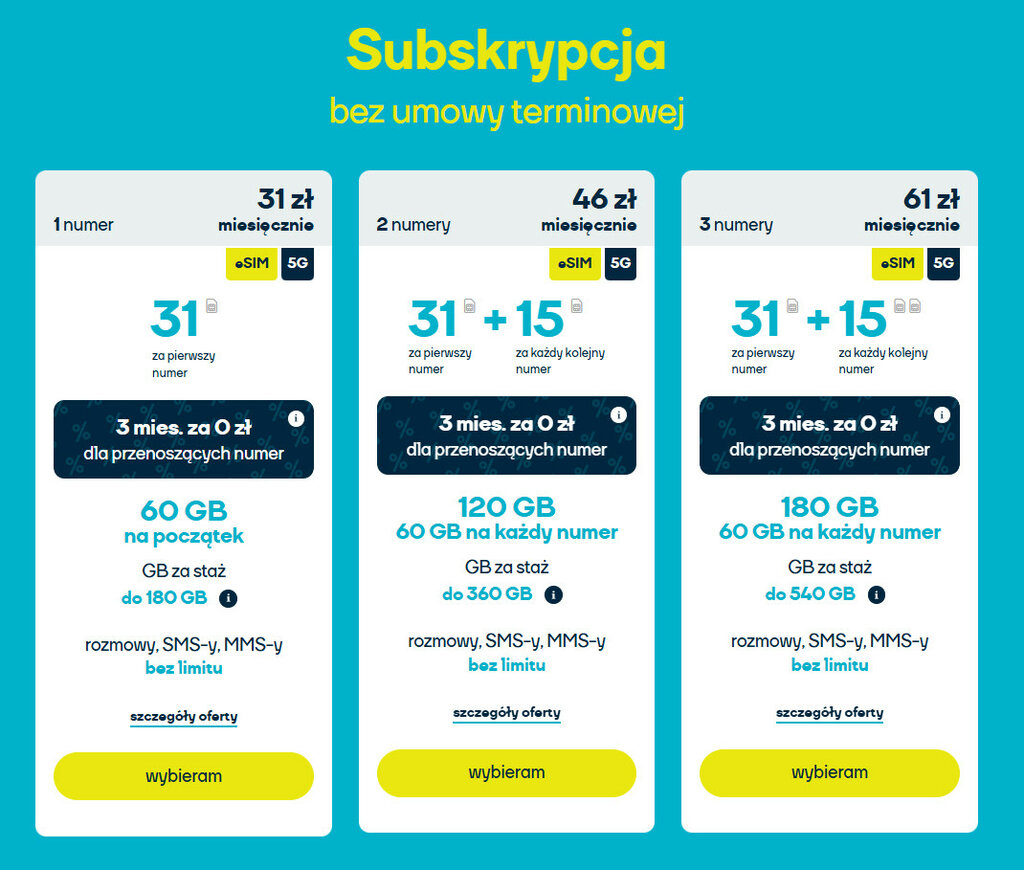 Ile możesz więc zaoszczędzić w porównaniu do subskrypcji nju z każdym numerem zamówionym oddzielnie? W zależności od liczby kart SIM, jest to od 16 do aż 64 złotych miesięcznie, a w porównaniu do oferty na kartę oszczędności wynoszą od 12 do 54 złotych każdego miesiąca. Każda osoba dysponuje niezależną paczką GB. W dodatku przenosząc numer do nju, otrzymasz w promocji 3 miesiące za 0 złotych, ale tylko w subskrypcji oraz w abonamencie.