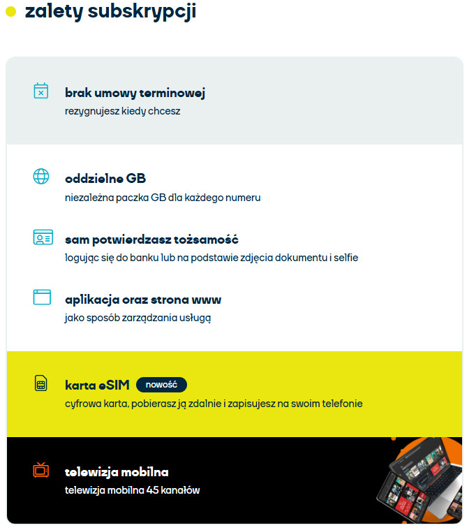 Poza tym w subskrypcji nju mobile masz możliwość zamówienia wirtualnej karty eSIM, a w cenie pakietu zyskasz też dostęp do telewizji mobilnej. Podstawowy pakiet TV dostępny jest też w bezterminowym abonamencie, ale nie ma w nim opcji zakupu eSIM. W przeciwieństwie do subskrypcji, obu tych dodatków nie ma w prepaidzie nju.