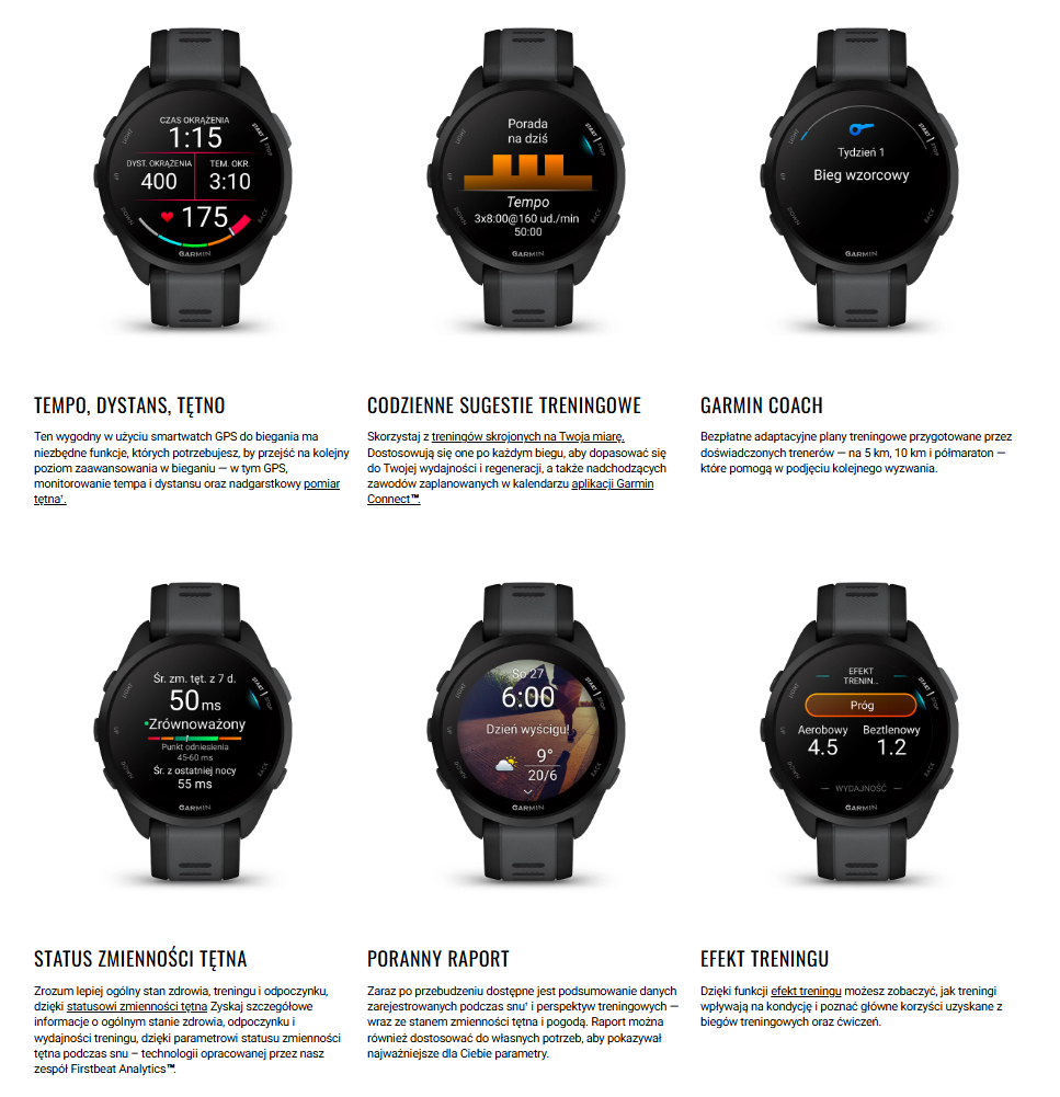 Poza tym Forerunner 165 Music może pochwalić się płatnościami zbliżeniowymi Garmin Pay, odpornością do 5 ATM, możliwością słuchania piosenek bez telefonu (dzięki Spotify, Deezer, Amazon Music), a także mnóstwem trybów treningowych. Gdybyś jednak szukał/a innego smartwatcha, sprawdź nasz ranking Top-10.