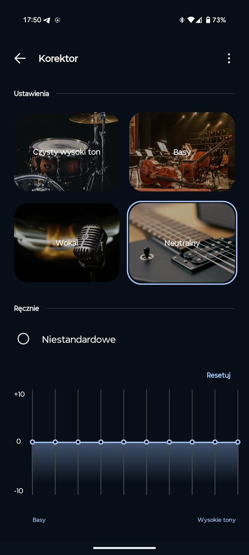 Do dyspozycji mamy oczywiście tryb podstawowy, ale prócz niego jest jeszcze wokal, basy oraz czysty wysoki ton. Z tych dodatkowych, to raczej jedynym użytecznym zdaje się być wokal, który dobrze spełnia swoje zadanie w utworach, gdzie jest on bardzo istotny. Jest jeszcze oczywiście opcja manualnego manipulowania EQ, ale to już bardzo subiektywny obszar.