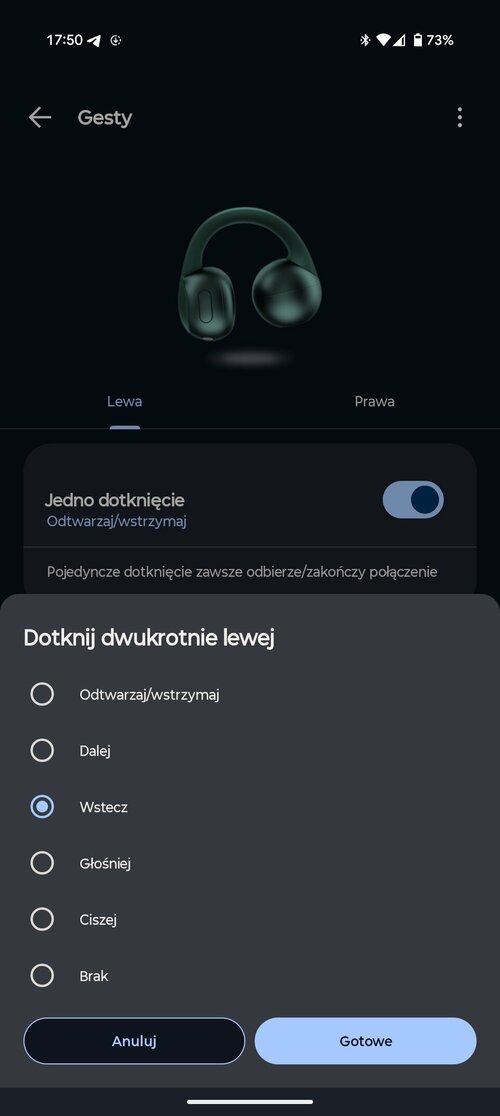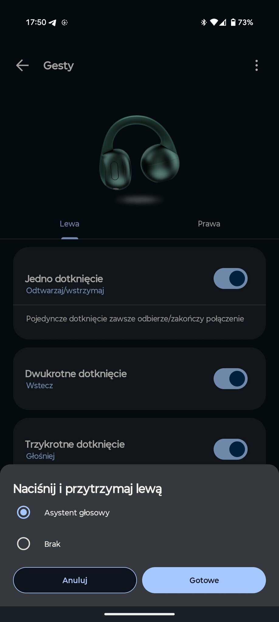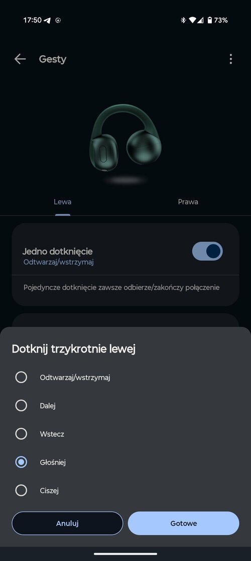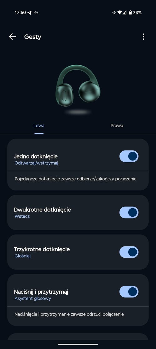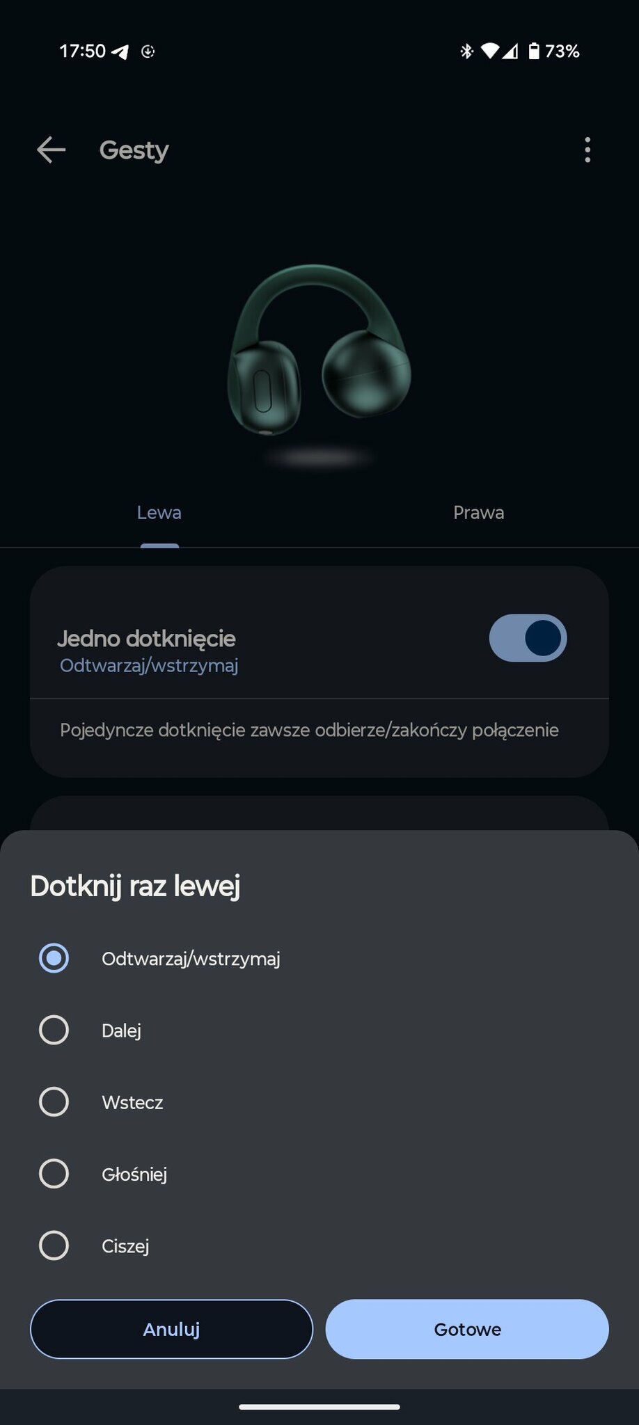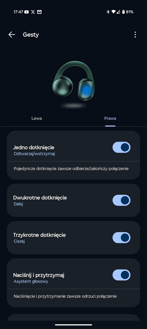 Jak już zauważyliście, można dostosować niezależnie od siebie prawą i lewą słuchawkę — i to jest fajne rozwiązanie. Czy jest wystarczająco obszerne sterowania na start? W zasadzie obejmuje wszystko, co omawiane słuchawki mają do zaoferowania w tym zakresie. Nie mamy tutaj trybu transparentnego, czy ANC, więc odchodzą owe funkcje ze sterowania. Jest jak najbardziej dobrze, chociaż jak już wyżej wspominałem, chyba panele dotykowe byłyby lepszym rozwiązaniem.