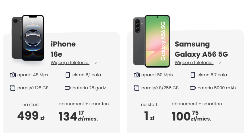 Ogólnie rzecz biorąc, propozycja Virgin nie jest droga sama w sobie. Raty miesięczne za sprzęt oscylują między 14,50 a 104,17 zł, a – przynajmniej w niektórych przypadkach – oferta prezentuje się podobnie do tanich abonamentów 5G Play i Plusha z telefonami 5G.
