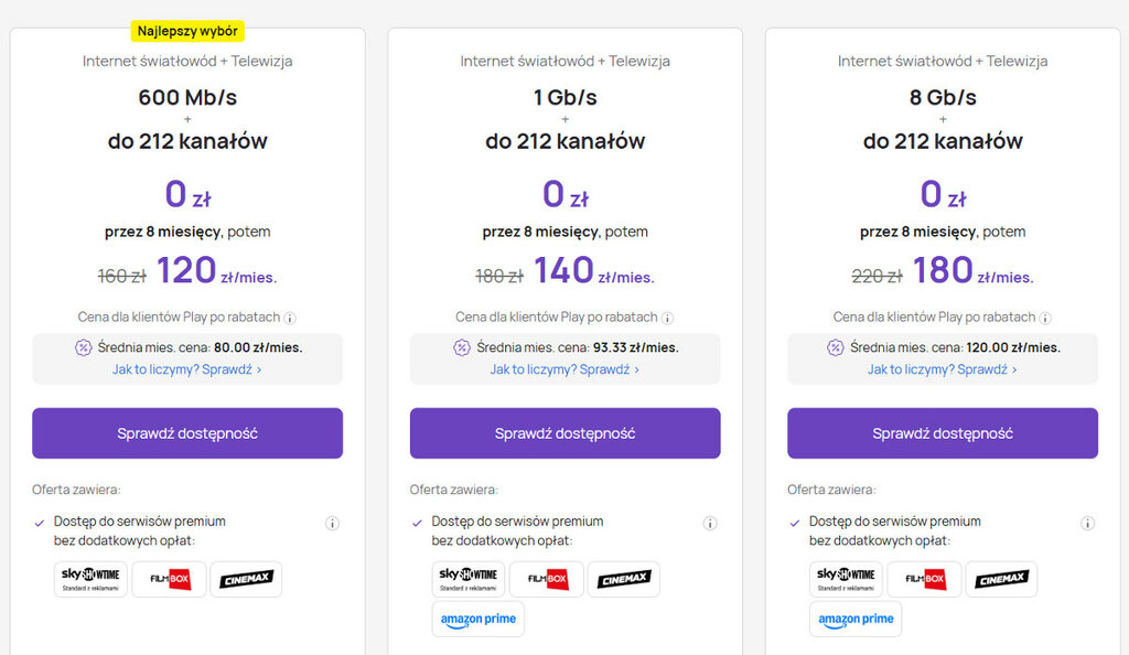 Nie licząc najtańszej propozycji, która ma też nieco mniej kanałów telewizyjnych, w cenie pakietu dostaniesz dostęp do serwisów SkyShowTime, FilmBOX, Cinemax oraz amazon prime! Ten ostatni jest dostępny tylko w ofertach ze światłowodem z 1-8 Gb/s, natomiast SkyShowTime to pakiet Standard z reklamami, ale zawsze coś. Ile jednak zapłacisz za to wszystko?