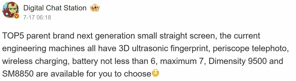 Digital Chat Station nie zostawia nas oczywiście bez szczegółów specyfikacji. Dzięki jego informacjom wiemy, że w specyfikacji pojawi się flagowy procesor. W zależności od marki ma to być MediaTek Dimensity 9500 lub Snapdragon 8 Elite 2. Stawiam też, że 16 GB RAM będzie tu standardem.