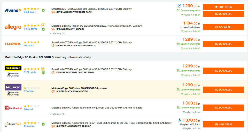 Rabat ten łączy się z promocją 3 rat za 0 zł w Orange, która z kolei obejmuje kilka modeli smartfonów. Jednym z nich jest właśnie Motorola Edge 60 Fusion, która… w abonamencie Orange jest prawie 2 razy tańsza!