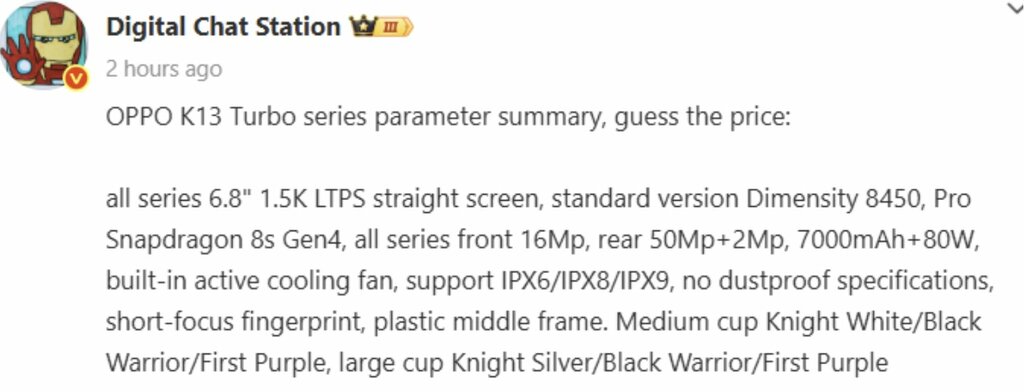 Do tego pojawi się oczywiście przystawka z jeszcze większym wentylatorem. To pozwoli schłodzić procesory w Oppo K13 Turbo i Turbo Pro. Te nie są takie same – tańszy model dostanie MediaTeka Dimensity 8450, droższy – Snapdragona 8s Gen 4. Wracając do części wspólnej, mówimy o plastikowej ramce i kiepskich aparatach, tu wyrażonych jako 50 MP matryca główna oraz 2 MP makro.