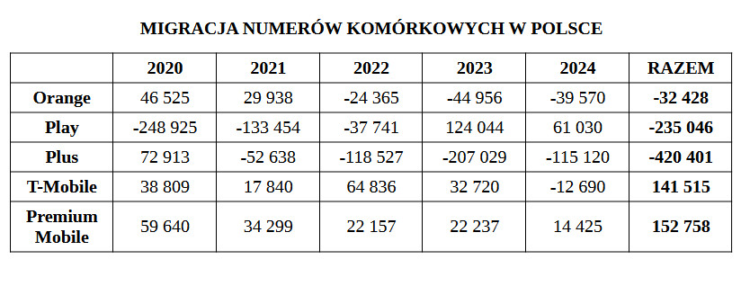 W latach 2020-2024 przenosiliśmy rok do roku od ~1,36 do 1,51 mln numerów komórkowych, a tendencja jest nieznacznie zwyżkowa. Możemy spodziewać się co najmniej zbliżonych liczb za bieżący rok. Możliwe jednak, że najlepsze lata Premium Mobile ma już za sobą, gdyż w 2024 wyprzedziły go nie tylko sieci z Wielkiej Czwórki.