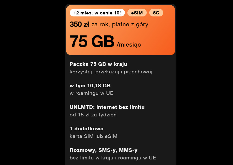 W tej cenie dostaniesz m.in. eSIM, usługi bez limitu i 75 GB krajowego transferu. W roamingu UE jest go aż 10,18 GB, co jest jedną z najwyższych wartości spośród wszystkich ofert na telefon do 30 złotych.