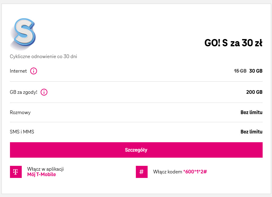 Aby go zyskać, aktywuj pakiet GO! S. Jego koszt to równe 30 zł. Magentowy operator da Ci nielimitowane usługi do wszystkich, a także 30 GB internetu w kraju, z czego 15 GB pochodzi z bonusu za doładowanie. Za wyrażenie zgód marketingowych zyskasz też w bonusie 200 GB na 30 dni.