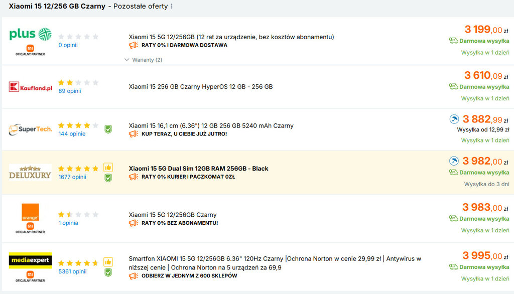 I tak, i nie. Tak, bo jak popatrzysz na porównywarkę Ceneo, to obecne ceny Xiaomi 15 zaczynają się od 3199 złotych, co jest właśnie ofertą Plusa i Plusha. Z drugiej strony, dosłownie w ostatni weekend pisaliśmy o promocji Xiaomi 15, w której cena za smartfona spadała w jednym ze sklepów online do 2949 złotych. Nawet jeśli przegapiłeś tamtą okazję, to obecna oferta i tak bije na głowę rywali. Dlaczego?