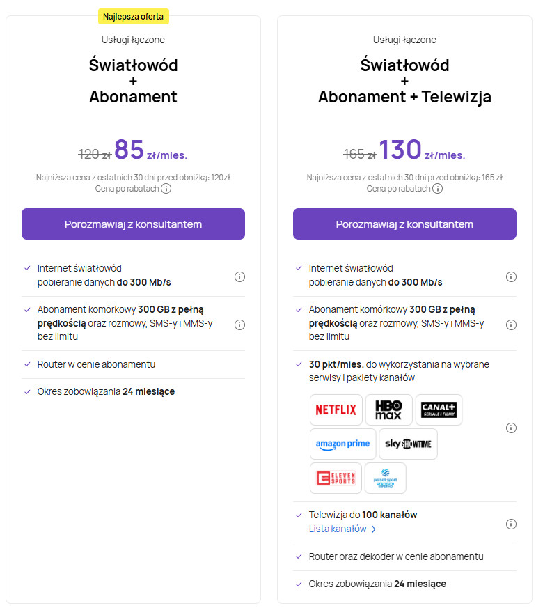 Rabat -35 złotych to upust miesięczny, bowiem w skali całej, dwuletniej umowy z operatorem zyskasz teraz aż 840 złotych. Rabat obowiązuje w 2 różnych pakietach 2w1. W każdym z nich dostaniesz internet światłowodowy o prędkości łącza do 300 Mb/s, a także abonament komórkowy z nielimitowanymi rozmowami, SMS-ami i MMS-ami, a także transferem rzędu 300 GB. Gdzie zatem tkwi różnica?