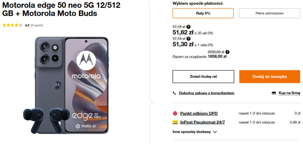 Nie wspomniałem na samym początku, ale Motorola Edge 50 Neo w Orange sama w sobie jest przeceniona. Jej cena wynosi teraz 1858 złotych, a przed obniżką było to 2058 złotych. W sumie zaoszczędzisz więc 200 złotych i jeszcze zyskasz bezprzewodowe słuchawki Moto Buds w prezencie.