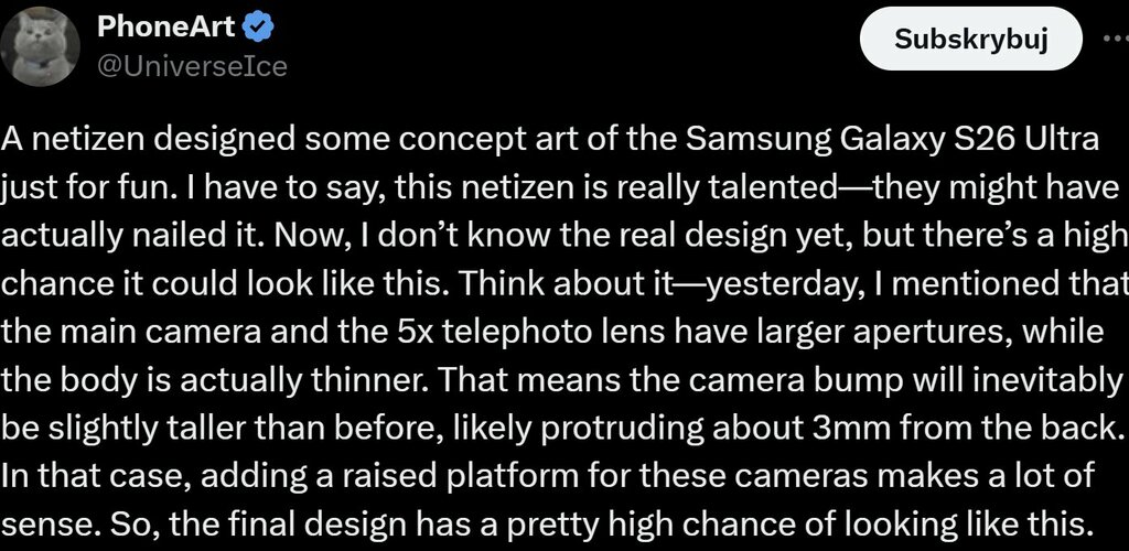 Samsung Galaxy S26 Ultra pokazuje design, a do tego znany leakster potwierdził kilka informacji na temat jego specyfikacji. Wizja niebezpiecznie zbliża się do Folda, a cierpi na tym jeden z najważniejszych elementów wyposażenia.
